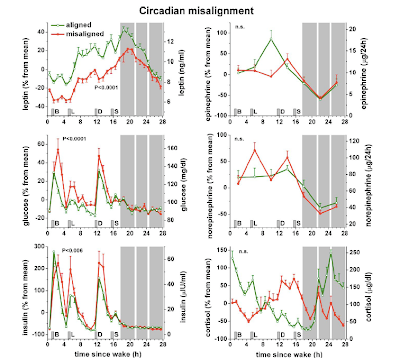 There is less expression of leptin when the sleep phases are misaligned (upper left graph). As explained previously, low leptin in the body means it will signal the brain to feel hungry and so made us to consume more meal than we normally do.
